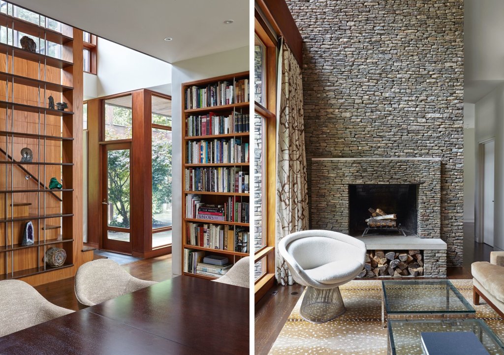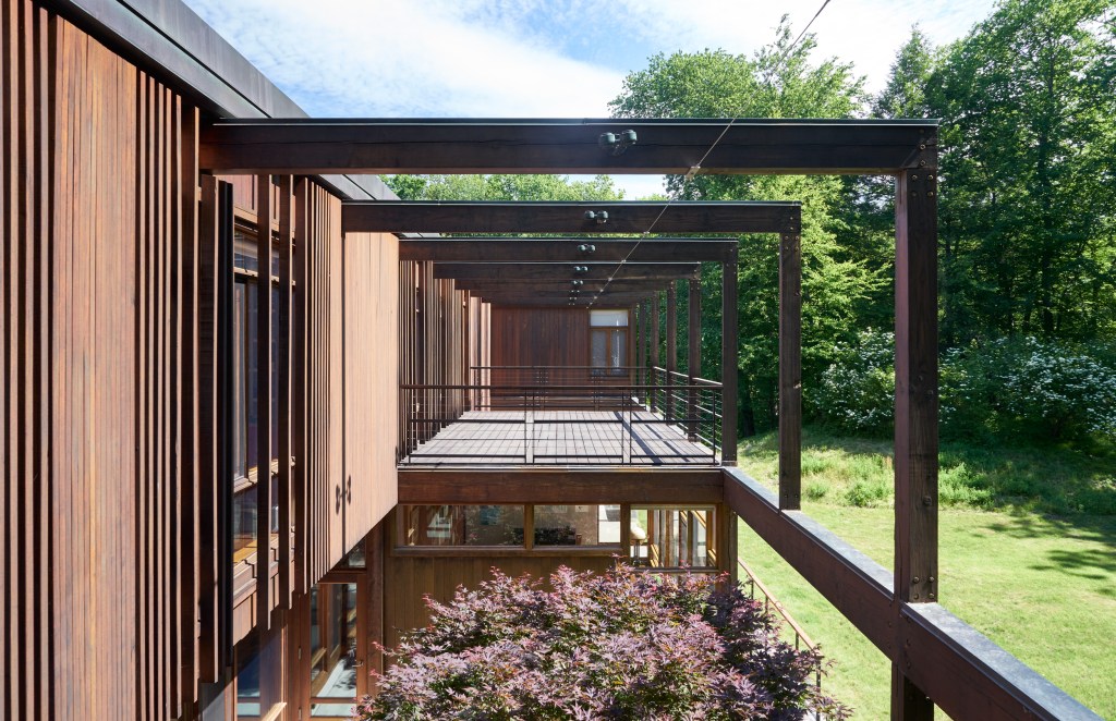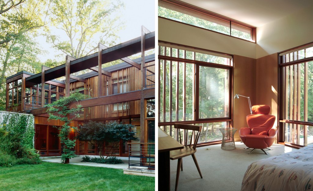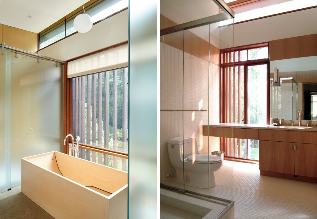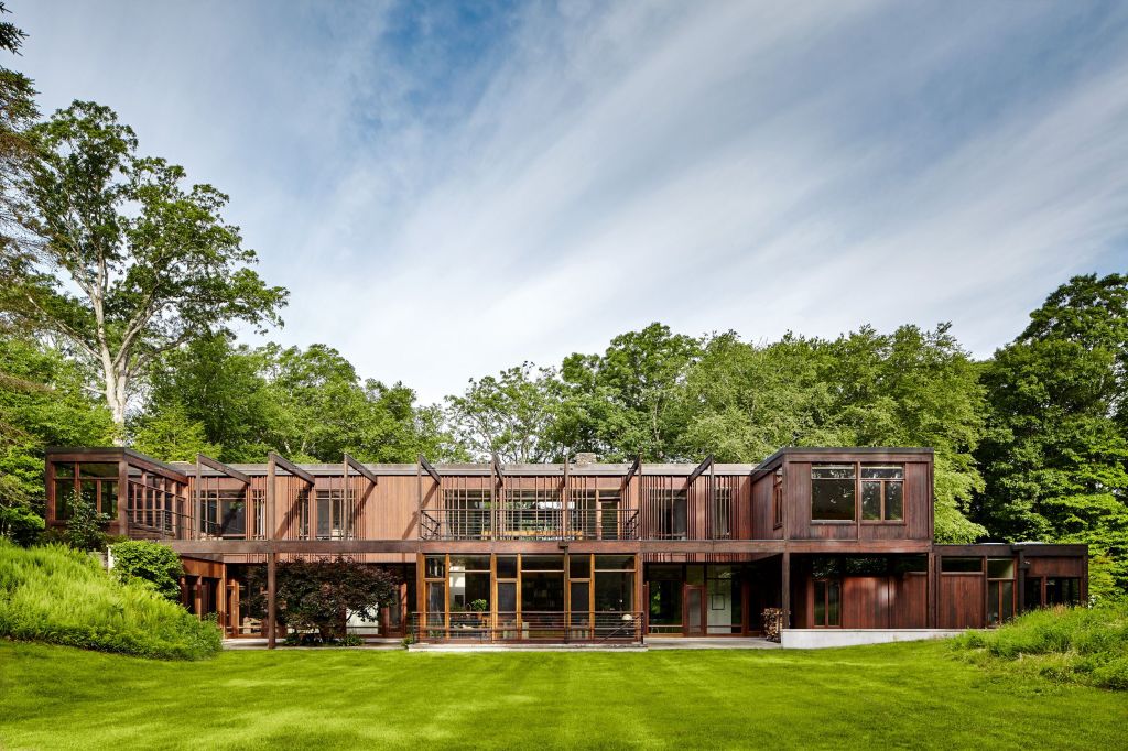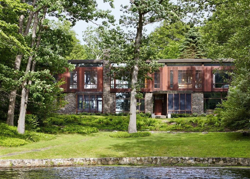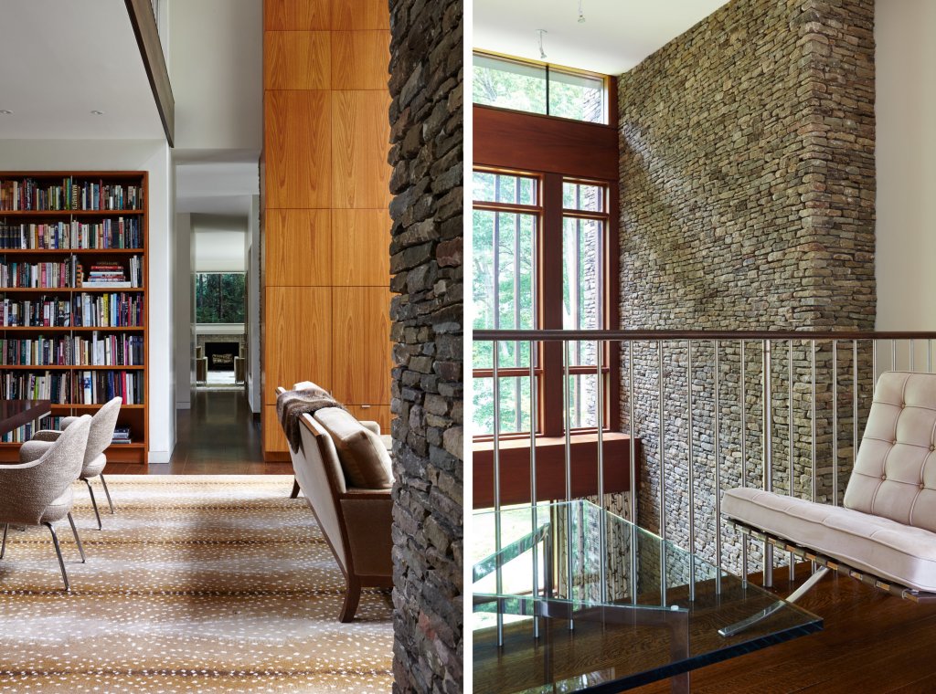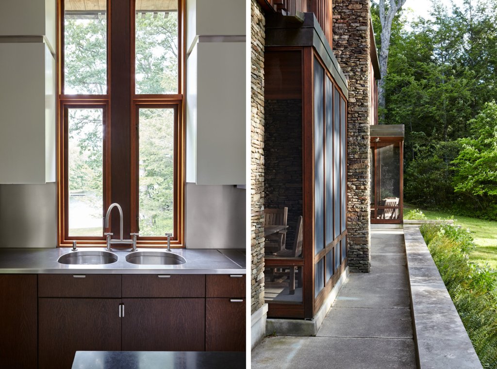 A family home that is primarily one room wide, allowing dual exposures toward a woodland and a pond that is part of the New York watershed, and is built in materials natural to the site; done in collaboration with interior designer Kerry Wilson.